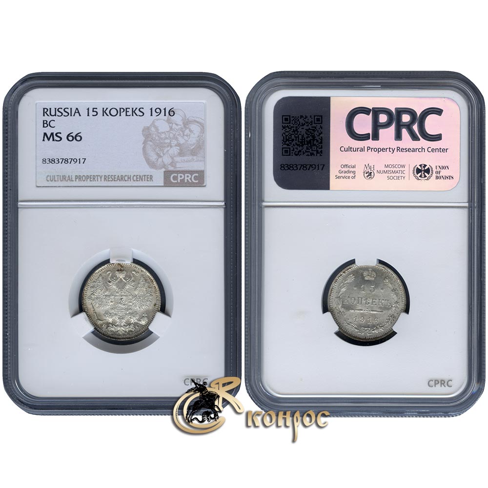 Россия 15 копеек, 1916 год. СПБ ВС. Слаб CPRC. MS66