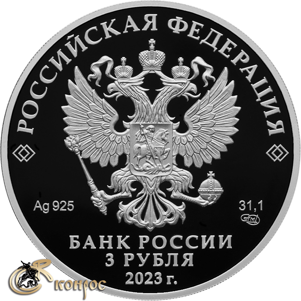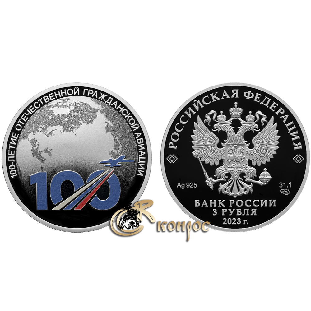 Россия 3 рубля, 2023 год. 100-летие отечественной гражданской авиации. Ag925, 31,1 гр