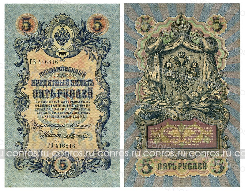 Бона. Россия 5 рублей, 1909 год. Государственный кредитный билет. Коншин - Шагин