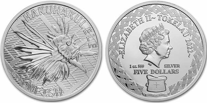 Токелау 5 долларов, 2022 год. Крылатка. Ag999, 31,1 гр