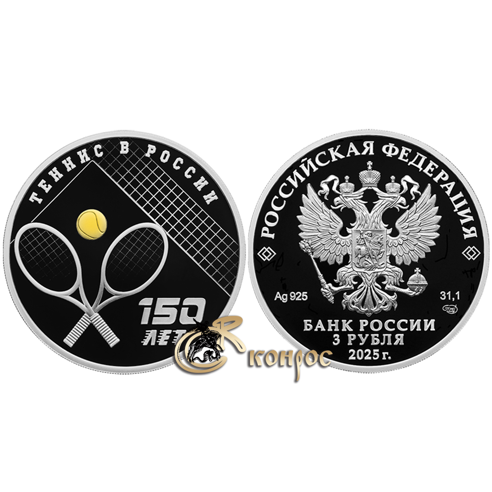 Россия 3 рубля, 2025 год. 150-летие тенниса в России. СПМД. Ag925. 31,1 гр