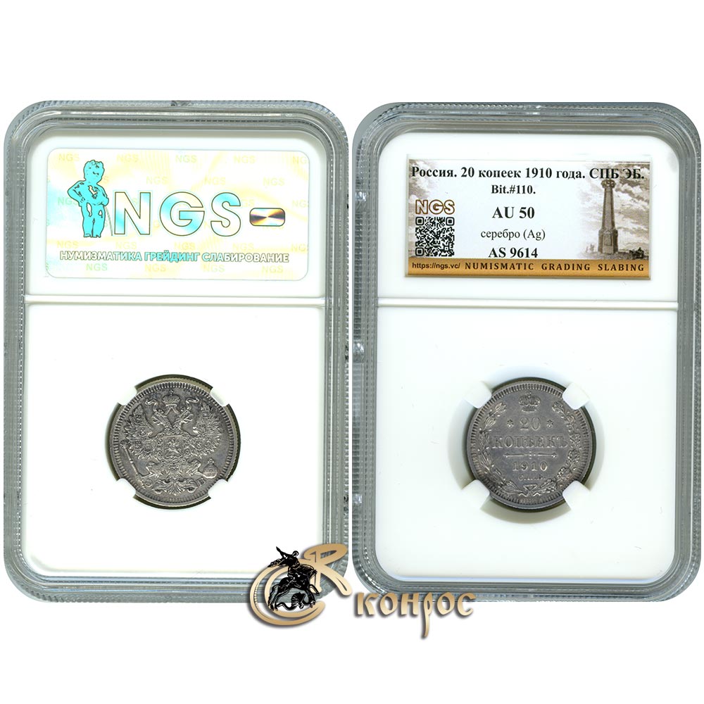 Россия 20 копеек, 1910 год. СПБ-ЭБ. Слаб NGS. AU50. Ag500, 3,64 гр