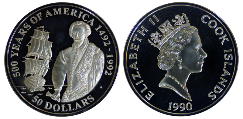 Острова Кука 50 долларов, 1990 год. 500 лет открытия Америки - Сэр Уолтер Рейли