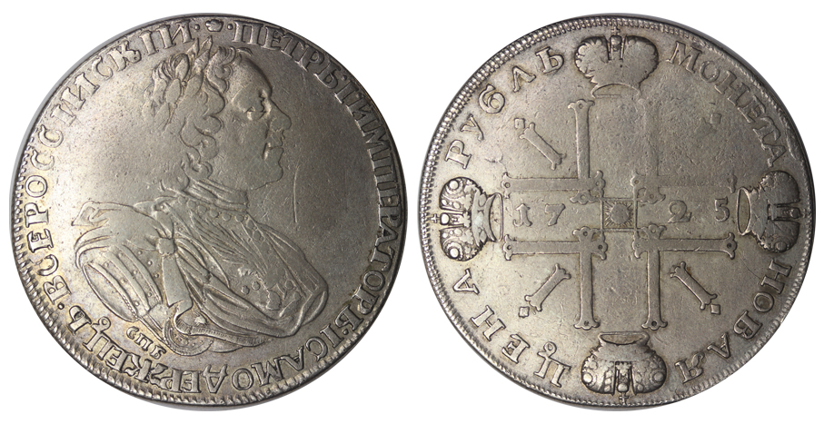 Россия 1 рубль, 1725 год. Петр I. Корона между точек