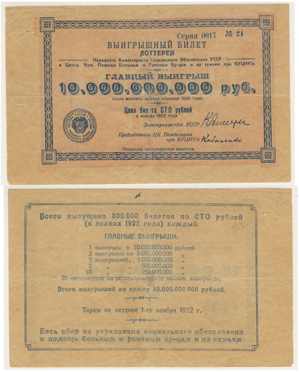 Бона. Россия 10000000000 рублей, 1922 год. Выигрышный билет. Помошь болным и раненым кр-цам и их семьям при ВУЦИКе