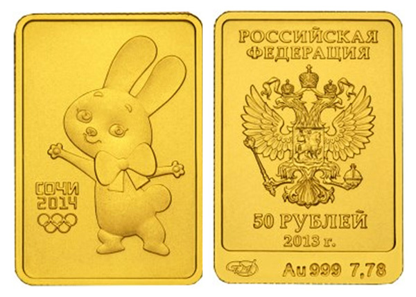 Россия 50 рублей, 2013 год. Сочи 2014. Зайка. СПМД. UNC