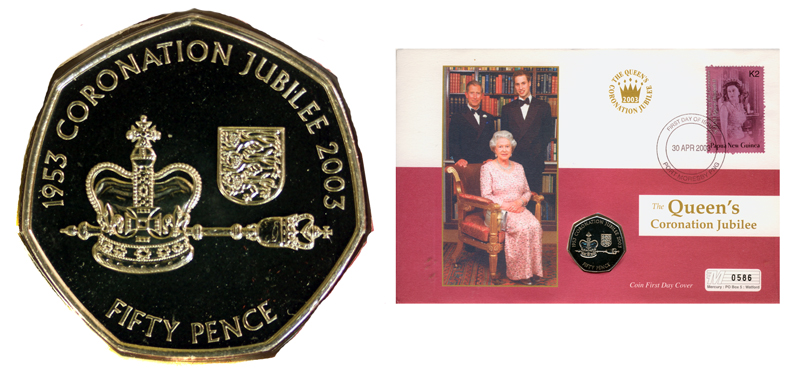 Джерси 50 пенсов, 2003 год. Юбилей коронации Елизаветы II. Конверт с маркой. Тип 6