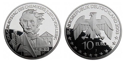 Германия 10 евро, 2003 год. Ученый Юстус фон Либих. Proof