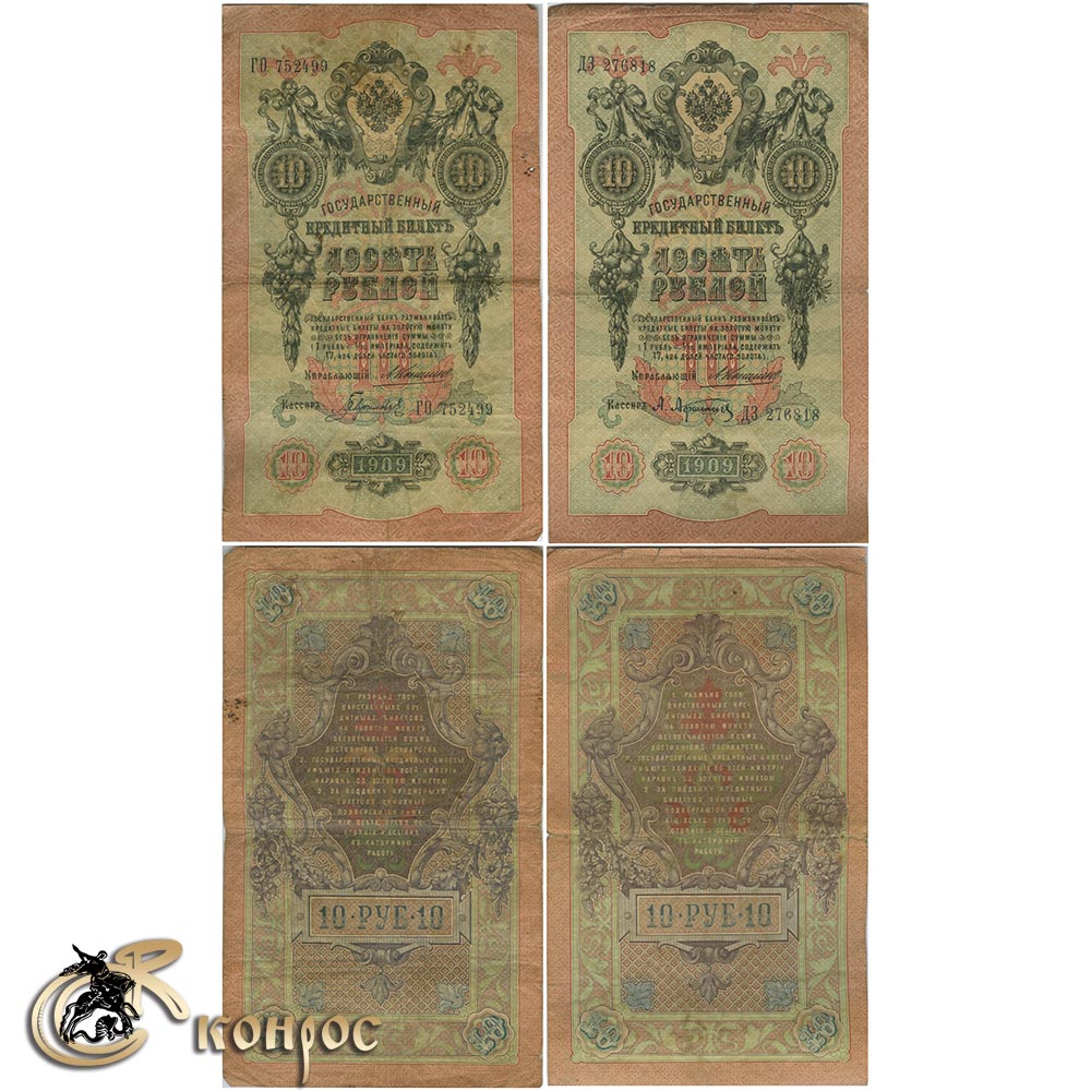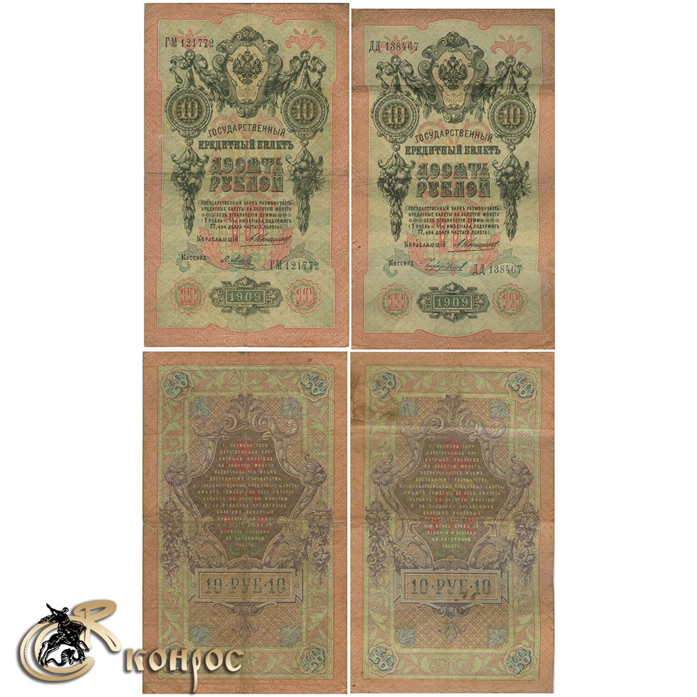 Набор бон. Россия 10 рублей, 1909 год. Коншин. (4 шт.). Разные кассиры