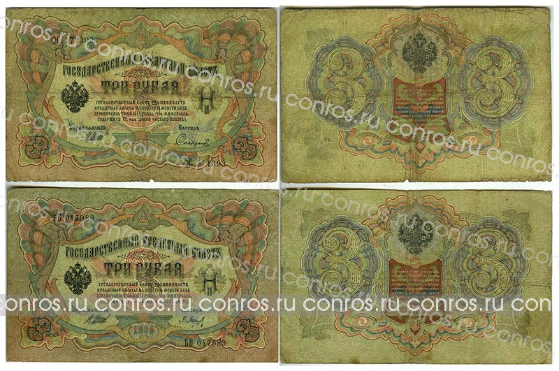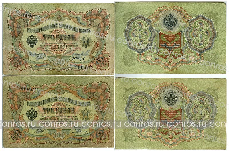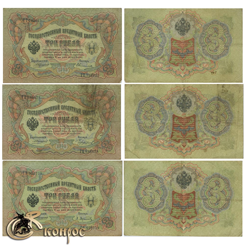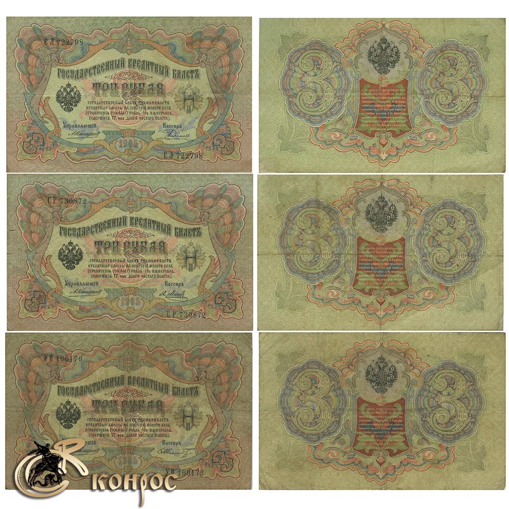 Набор бон. Россия 3 рубля, 1905 год. Коншин (6 шт.). Разные кассиры