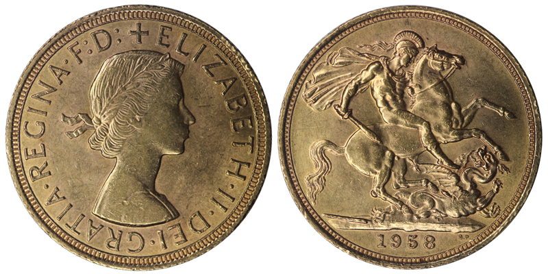 Великобритания 1 соверен, 1958 год. Au917, 7,99 гр.