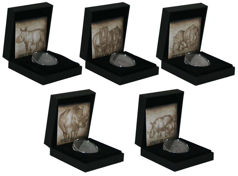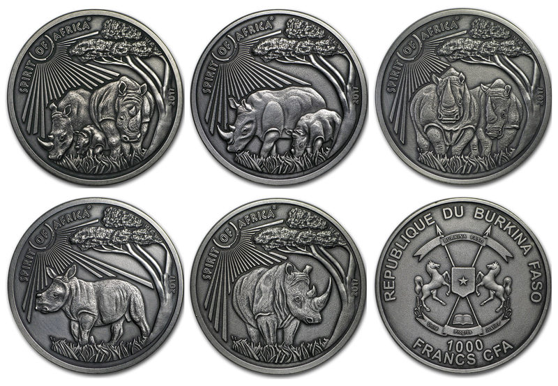 Набор монет. Буркина-Фасо, 1000 франков, 2017 год. Дух Африки. Носороги. Ag999, 31,1 гр